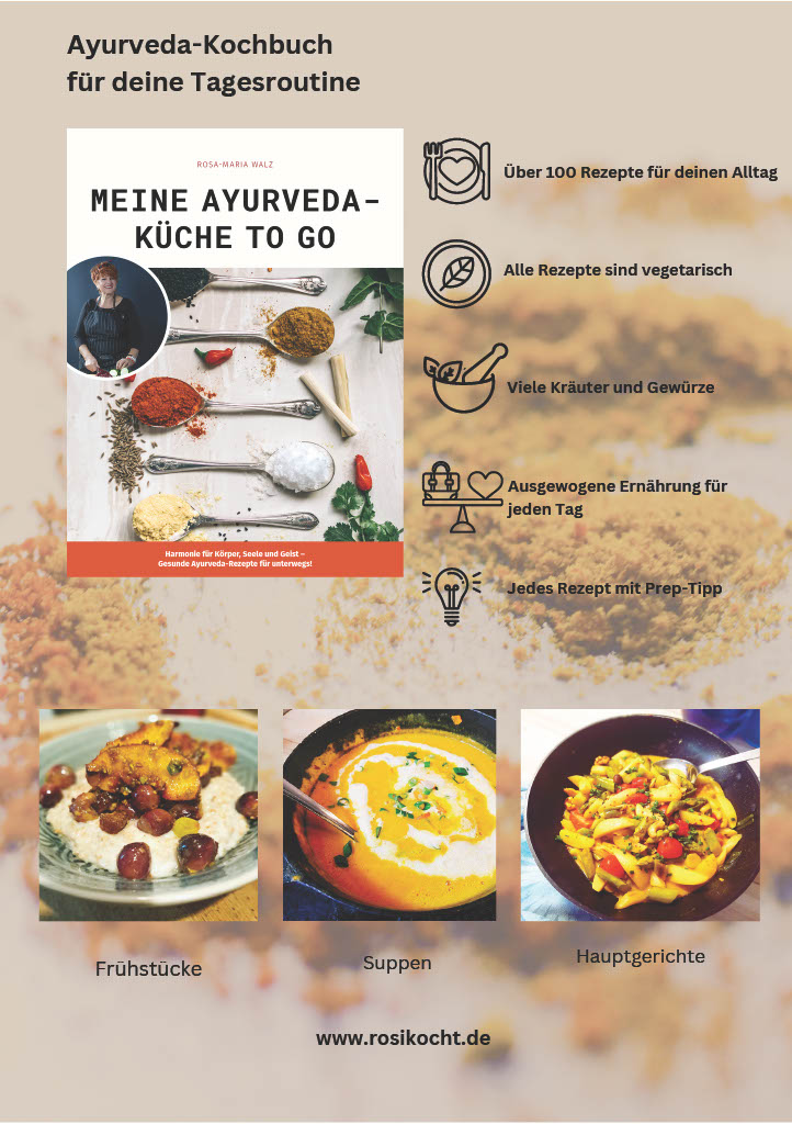 Rosa-Maria Walz, Ayurveda-Beraterin und erfahrene Köchin, verbindet fundiertes ayurvedisches Wissen auf 123 Seiten mit über 90 wohltuenden Rezepten, die sich ideal vorbereiten, mitnehmen oder am nächsten Tag aufwärmen lassen. Von warmen Frühstücksbreien über nährende Suppen, herzhafte Hauptgerichte bis hin zu Süßem und Broten – alle Rezepte sind darauf ausgerichtet, dein Verdauungsfeuer (Agni) zu stärken und dich nachhaltig zu nähren.